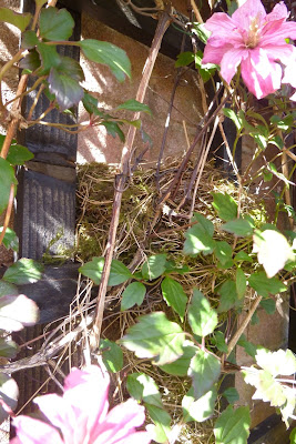 Then this morning although the nest still looked perfect the Song thrush had vanished and below the nest I found a broken egg.